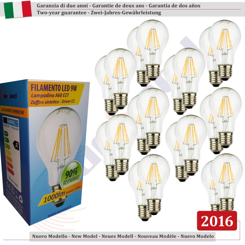 SunSeed, 20 X E27 9W LAMPADINA LED GOCCIA A60 A FILAMENTO LED IN ZAFFIRO SINTETICO Luce calda 2700K 1000 Lumen