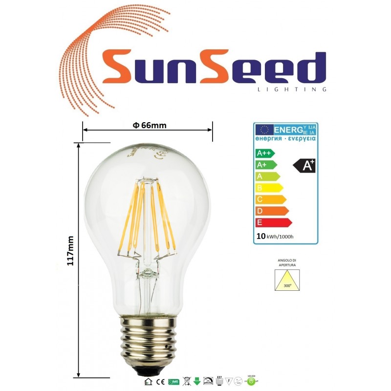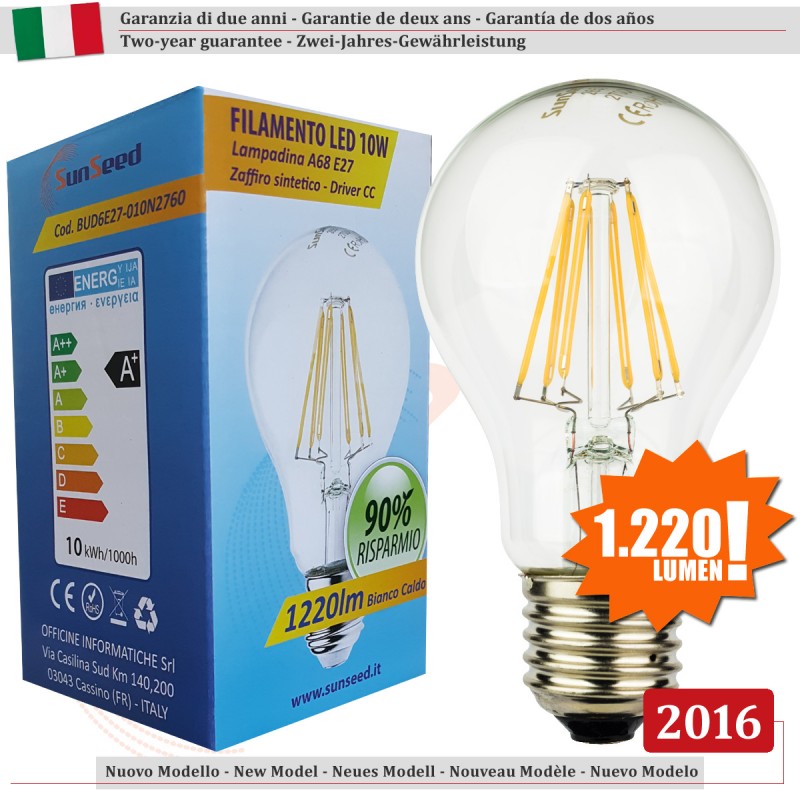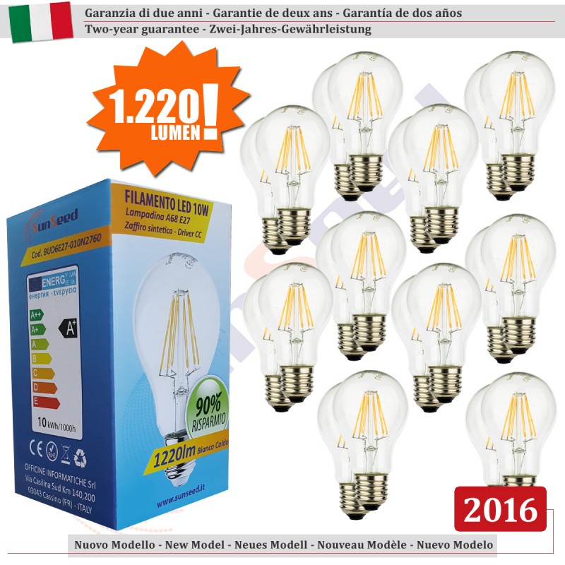 Confezione di venti Lampadine Goccia SunSeed 10W in vetro a Filamento LED in Zaffiro Sintetico, luce calda 2700K, attacco E27, 300°, ideali per sostituire la classica lampadina a incandescenza da 100W ricalcandone l'aspetto e il colore caldo e la diffusione della luce, consentono un risparmio di energia elettrica superiore all'85%.