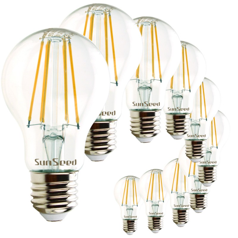 Confezione di dieci Lampadine Goccia SunSeed 7W in vetro a Filamento LED, luce calda 2700K, attacco E27, 300°, ideali per sostituire la classica lampadina a incandescenza da 75W ricalcandone l'aspetto e il colore caldo e la diffusione della luce, consentono un risparmio di energia elettrica superiore al 90%.