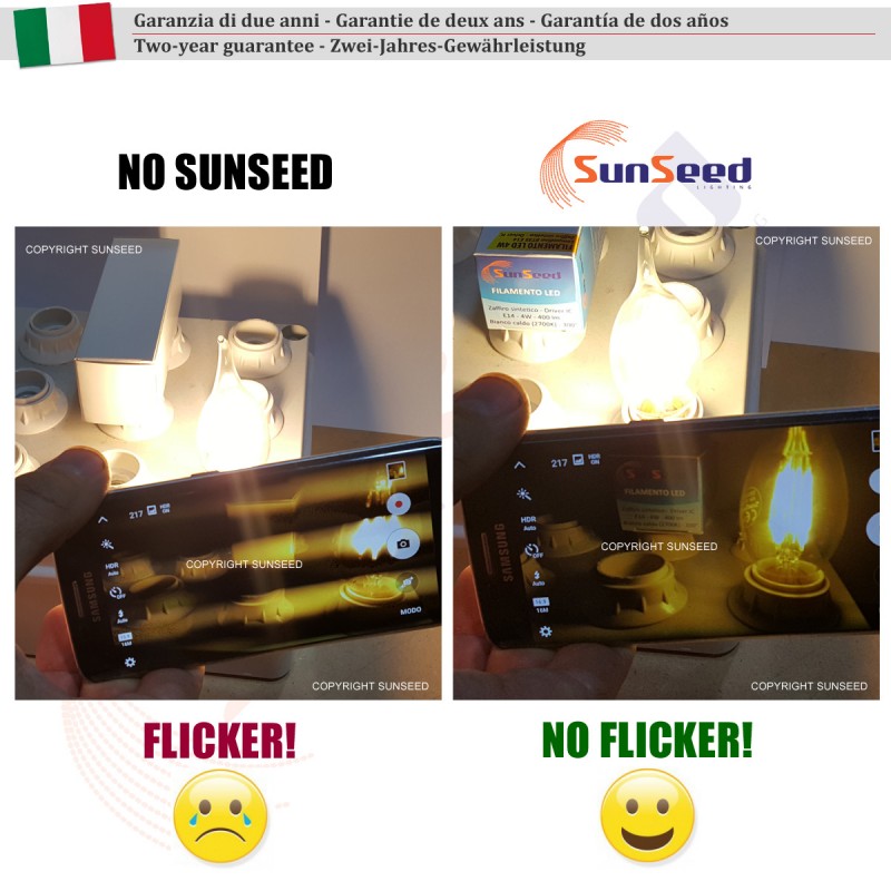 Inoltre le lampadine a Filamento LED SunSeed sono dotate di Driver IC che evita lo sfarfallio della luce prodotto dagli alimentatori RC (resistenza/condensatore) montati sulle lampade più economiche.