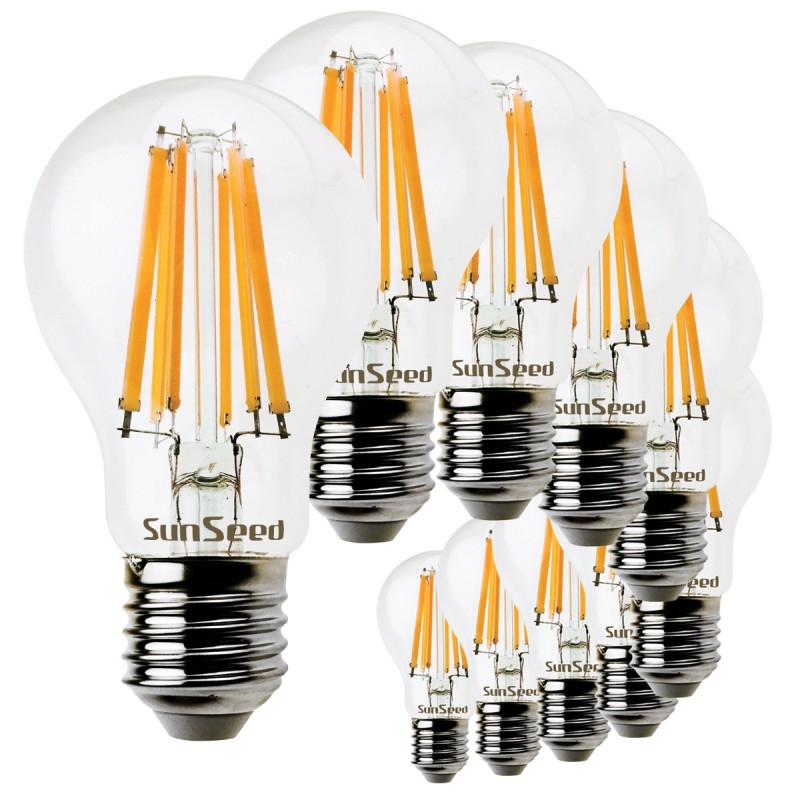Confezione di dieci Lampadine Goccia SunSeed 10W in vetro a Filamento LED in Zaffiro Sintetico, luce calda 2700K, attacco E27, 300°, ideali per sostituire la classica lampadina a incandescenza da 100W ricalcandone l'aspetto e il colore caldo e la diffusione della luce, consentono un risparmio di energia elettrica superiore all'85%.