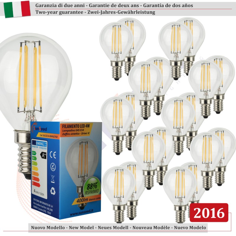 SunSeed, 20 X E14 4W LAMPADINA LED SFERA G45 A FILAMENTO LED IN ZAFFIRO SINTETICO Luce calda 2700K 400 Lumen 300° Driver IC