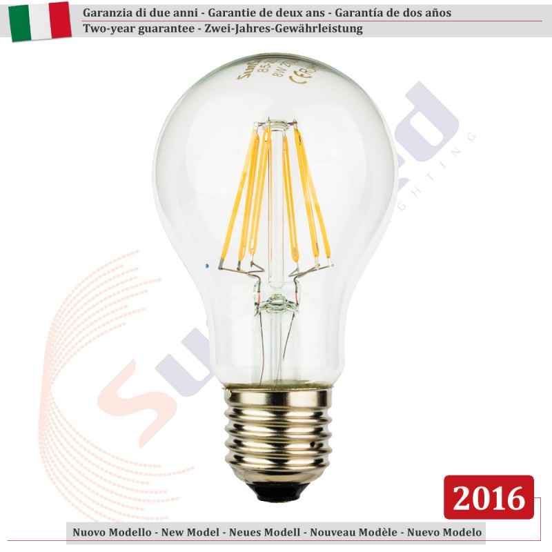 Confezione di sei Lampadine Goccia SunSeed 8W in vetro a Filamento LED in Zaffiro Sintetico, luce naturale 4000K, attacco E27, 300°, ideali per sostituire la classica lampadina a incandescenza da 75W ricalcandone l'aspetto e il colore caldo e la diffusione della luce, consentono un risparmio di energia elettrica superiore all'85%.