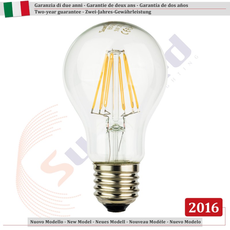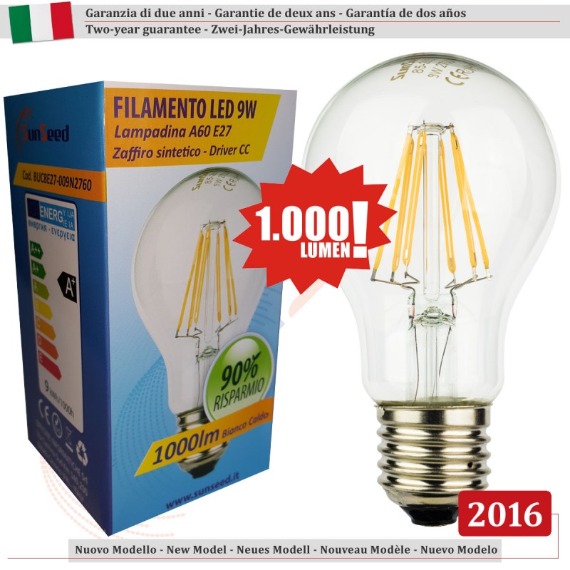SunSeed, 6 X E27 9W LAMPADINA LED GOCCIA A60 A FILAMENTO LED IN ZAFFIRO SINTETICO Luce calda 2700K 1000 Lumen